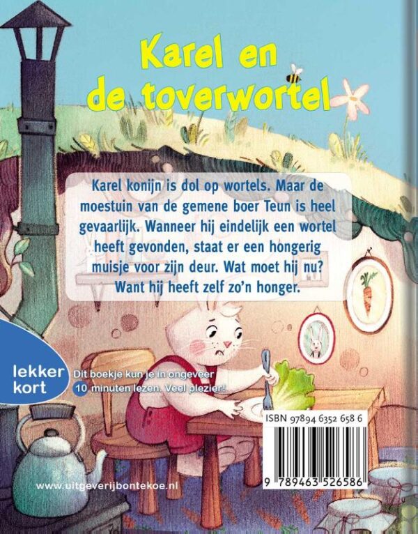 Karel konijn is dol op wortels. Maar de moestuin van de gemene boer Teun is heel gevaarlijk. Wanneer hij eindelijk een wortel heeft gevonden, staat er een hongerig muisje voor zijn deur. Wat moet hij nu? Want hij heeft zelf zo’n honger.