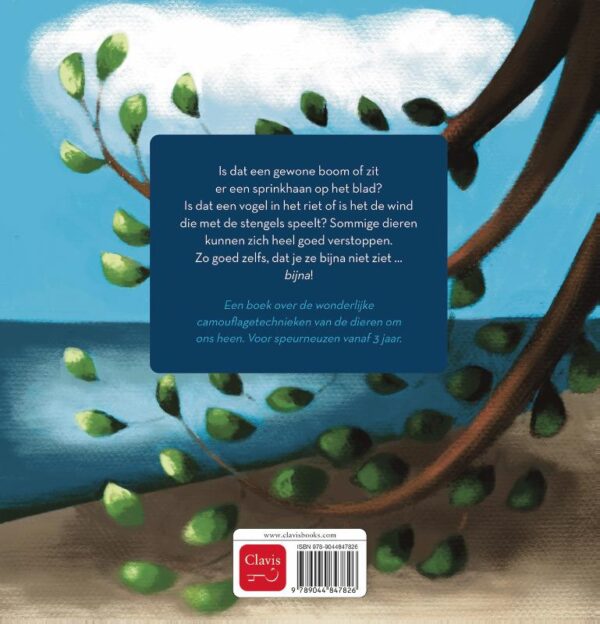 Is dat een gewone boom of zit er een sprinkhaan op het blad? Is dat een vogel in het riet of is het de wind die met de stengels speelt? Sommige dieren kunnen zich heel goed verstoppen. Zo goed zelfs, dat je ze bijna niet ziet … bíj́na!
