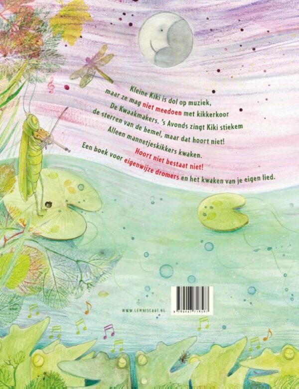 Maar Kiki zingt ook graag. Dat hoort niet, vindt de kikkerdirigent, dus Kiki zingt alleen voor zichzelf, voor de maan en voor de krekel die viool speelt.