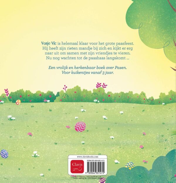 Vosje Vic is helemaal klaar voor het grote paasfeest. Hij heeft zijn rieten mandje mee, en hij kijkt er erg naar uit om samen met zijn vriendjes te vieren. Nu nog wachten tot de paashaas langskomt …