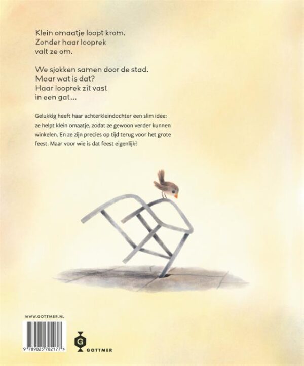 Klein omaatje gaat naar de stad om zich op te tutten, samen met haar achterkleindochter. Eerst naar de kapper, dan een nieuwe jurk ophalen. Met haar rollator schuifelt klein omaatje heel langzaam over het plein. Dan opeens… blijft haar rollator steken in een gat. Hij zit muurvast. Gelukkig heeft haar achterkleindochter een slim idee: ze kromt haar rug en klein omaatje gebruikt haar als rollator! Tjoeketjoek over het plein, naar de kapper, naar de jurk en weer naar huis. Precies op tijd voor het feest. Maar voor wie is dat feest eigenlijk?