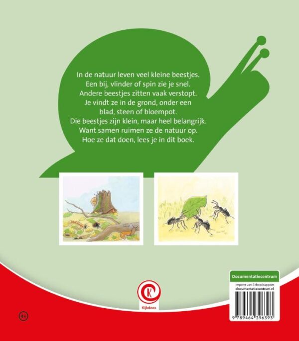 In de natuur leven veel kleine beestjes. Een bij, vlinder of spin zie je snel. Andere beestjes zitten vaak verstopt. Je vindt ze in de grond, onder een blad, steen of bloempot. Die beestjes zijn klein, maar heel belangrijk. Want samen ruimen ze de natuur op. Hoe ze dat doen, lees je in dit boek.