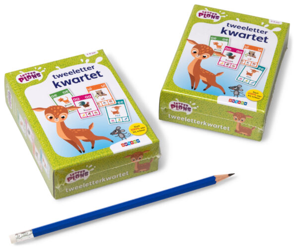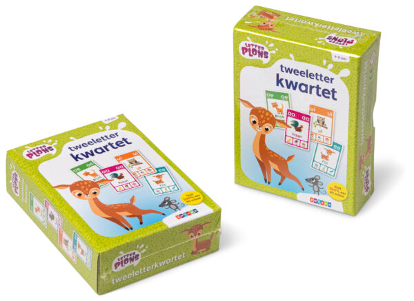 De oe van poes, de aa van aap en de ee van peer. Ze komen allemaal voorbij in dit tweeletterkwartet van Letterplons. Verzamel zo snel mogelijk vier kaartjes met dezelfde letters.