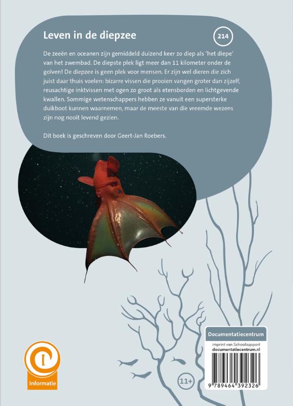 De zeeën en oceanen zijn gemiddeld duizend keer zo diep als ‘het diepe’ van het zwembad. De diepste plek ligt meer dan 11 kilometer onder de golven! De diepzee is geen plek voor mensen. Er zijn wel dieren die zich juist daar thuis voelen: bizarre vissen die prooien vangen groter dan zijzelf, reusachtige inktvissen met ogen zo groot als etensborden en lichtgevende kwallen. Sommige wetenschappers hebben ze vanuit een supersterke duikboot kunnen waarnemen, maar de meeste van die vreemde wezens zijn nog nooit levend gezien.