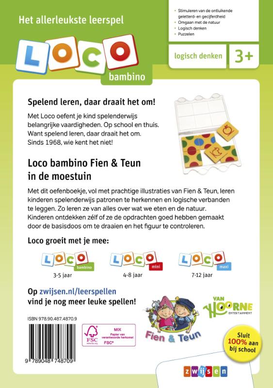 Met dit kleurrijke oefenboekje kunnen peuters en kleuters lekker puzzelen. Ze oefenen spelenderwijs met het herkennen van patronen en het leggen van logische verbanden. Al spelend leren kinderen bovendien van alles over de moestuin, over wat we eten en over de natuur. De prachtige illustraties van Fien & Teun op hun avonturenboerderij maken er een vrolijk geheel van. Kinderen ontdekken zélf of ze de opdrachten goed hebben gemaakt door de basisdoos om te draaien en het figuur te controleren. Spelend leren, daar draait het om bij Loco!