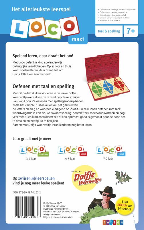 Met dit pakket oefenen kinderen spelenderwijs met taal en spelling. Samen met Dolfje Weerwolfje leren kinderen nog beter lezen en oefenen ze spellingsmoeilijkheden zoals bijvoorbeeld het verschil tussen au en ou, de klank nk en ng en het onderscheid tussen woorden eindigend op -tie en -sie. De Dolfje wereld uit de boeken van de razend populaire schrijver Paul van Loon prikkelt bovendien de fantasie. Met de Loco maxi basisdoos en de twee oefenboekjes kunnen kinderen creatief puzzelen met taal. Zijn de opdrachten goed gemaakt? Draai de doos om … en je weet het!