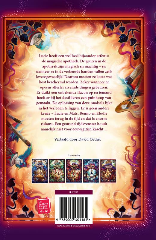 Lucie heeft een wel heel bijzonder erfenis: de magische apotheek. De geuren in de apotheek zijn magisch en machtig. En wanneer ze in de verkeerde handen vallen, zelfs levensgevaarlijk! Daarom moeten ze koste wat kost beschermd worden. Zeker wanneer er opeens allerlei vreemde dingen gebeuren. Er duikt een onbekende flacon op en iemand heeft er bij het destilleren een puinhoop van gemaakt. De oplossing van deze raadsels lijkt in het verleden te liggen. Er is geen andere keuze – de vrienden moeten terug in de tijd en dat is enorm riskant. Een geurend tijdsvenster houdt namelijk niet voor eeuwig zijn kracht…