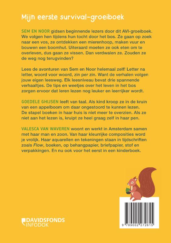 Sem en Noor gidsen beginnende lezers door dit AVI-groeiboek. We volgen hen tijdens hun tocht door het bos. Ze gaan op zoek naar een vos, ze ontdekken een mierenhoop, maken vuur en bouwen een boomhut. Uiteraard moeten ze ook eten om te overleven, dus gaan ze vissen. Dan verdwalen ze. Zouden ze de weg nog terugvinden?