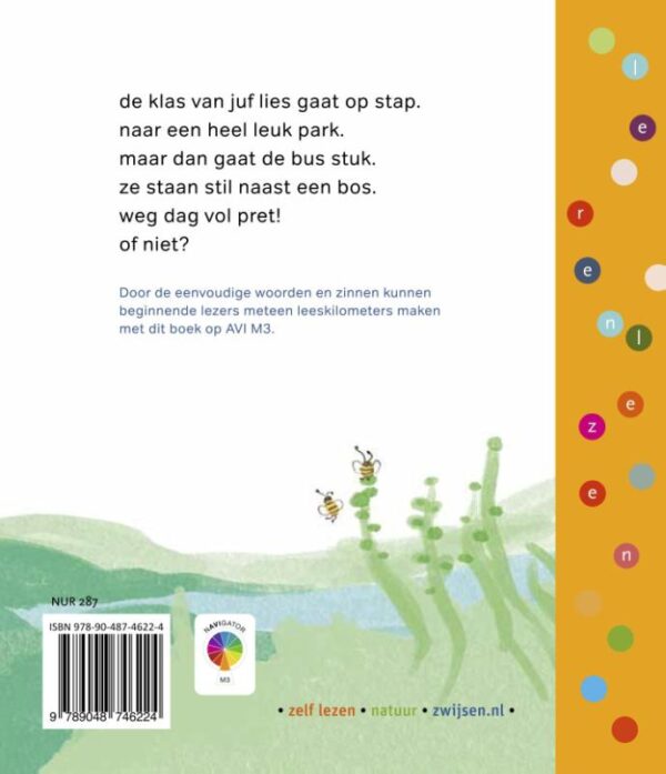 De nachtmerrie van iedere klas … de bus gaat stuk als je net op een gezellig schoolreisje gaat. Maar juf Lies zet alles op alles om er toch een leuke dag van te maken. Zal het haar lukken? Lees het hele verhaal zelf in dit boek voor beginnende lezers van 6-7 jaar. Dat is nog eens leuk leeskilometers maken!