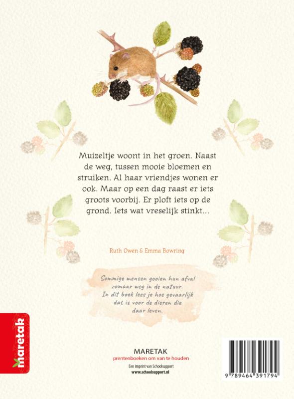 In dit prentenboek lopen fictie en non-fictie naadloos in elkaar over. Een leerzaam en spannend verhaal met sfeervolle illustraties over het gevaar van zwerfafval voor dieren, met name de dwergmuis.