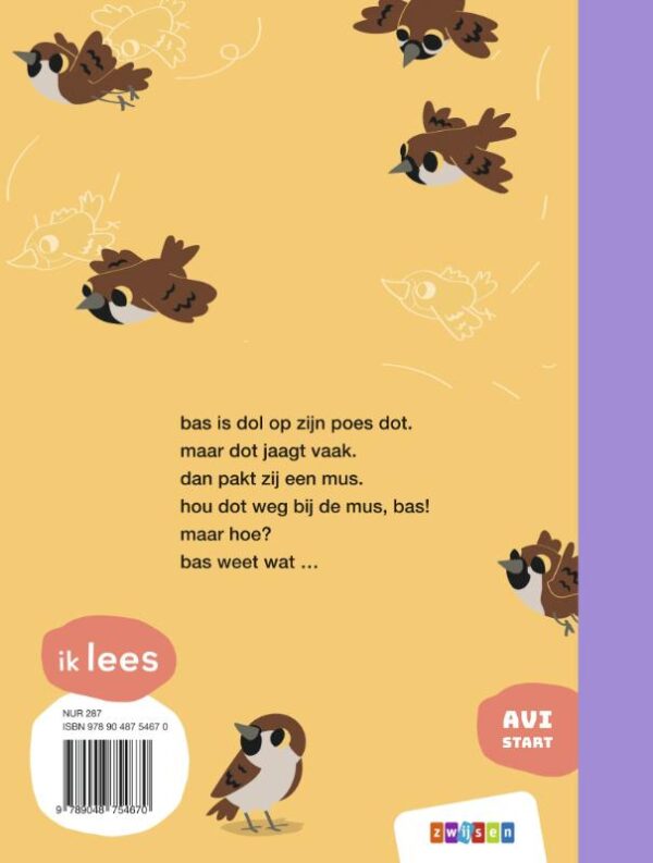 Poezen houden van jagen. En bas houdt van zijn poes dot. Maar bas houdt er niet zo van als dot jaagt op vrolijk fluitende musjes. Dus besluit hij om ervoor te zorgen dat dot geen andere diertjes kan vangen. Maar hoe houd je een poes tegen? Nieuwsgierige lezers kunnen niet wachten om daar achter te komen. Schrijfster Mandy Pijl heeft het verhaal zo opgebouwd dat kinderen de korte hoofdstukken graag uit willen lezen. Alleen dan weten ze hoe dit herkenbare avontuur afloopt. Nancy Kers maakte de illustraties bij dit verhaal op AVI Start niveau.