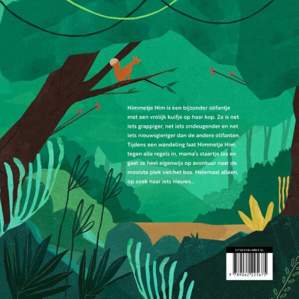 Tijdens een wandeling laat Nimmetje Nim, tegen alle regels in, mama’s staartje los. Ze gaat heel eigenwijs achter een prachtige kolibrie aan en vindt de mooiste plek van het bos. Een prachtig meer met een regenboog van kleuren die ze zelf tevoorschijn tovert met haar slurf. Mama is trots op haar eigenwijze Nimmetje, want die nieuwsgierigheid maakt haar juist zo bijzonder. En haar kuifje natuurlijk!