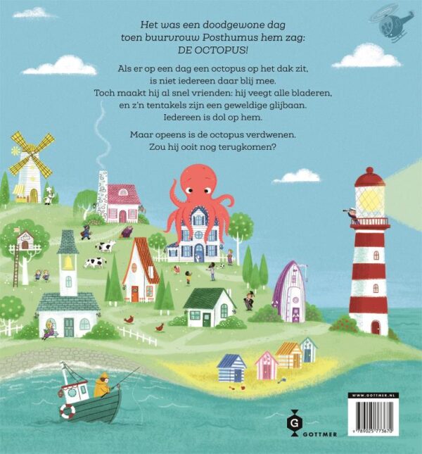 ‘Onze octopus’ is een vrolijk prentenboek van Peter Bently en Steven Lenton, op rijm vertaald door Gouden Griffel-winnaar Bette Westera. In ‘Onze octopus’ gebeurt er iets heel bijzonders. Op een doodgewone dag ziet de buurvrouw ineens iets raars op het dak: een enorme, oogverblindende, neon roze octopus! Eerst probeert de brandweer hem van het dak af te spuiten, maar dan blijkt dat het eigenlijk heel handig en gezellig is om een octopus op je dak te hebben. Met zijn acht tentakels is hij een geweldige voetballer, helpt hij met de was en het zoeken van kwijtgeraakte spullen, veegt hij blaadjes aan en… hij is een geweldige glijbaan. Alle buren worden jaloers, zij willen ook een octopus! Of een inktvis, dat is ook goed. ‘Onze octopus’ is een onverwacht, grappig en hartverwarmend prentenboek over het verwelkomen van vreemdelingen en nieuwelingen – ze zouden je leven zomaar eens beter kunnen maken!
