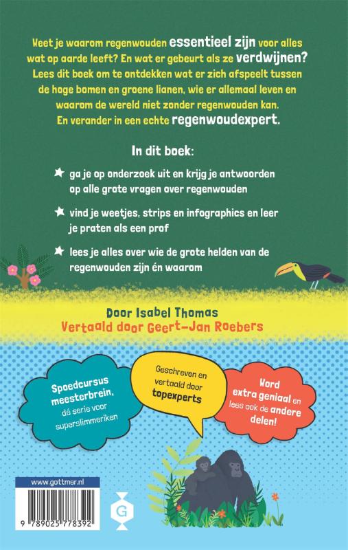 In dit zesde deel van de informatieve serie Spoedcursus meesterbrein ontdek je alle geheimen van de wondere wereld van het regenwoud. De regenwouden beslaan een enorm deel van onze aarde en herbergen een ongelooflijke diversiteit aan leven. Wist je dat er in de regenwouden talloze plant- en diersoorten wonen die nog niet zijn geïdentificeerd? Wil je meer te weten komen over de verbazingwekkende flora en fauna die in deze ecosystemen gedijen, evenals begrijpen waarom regenwouden van onschatbare waarde zijn voor onze planeet? Lees dan dit boek en word een regenwoudexpert. Ontdek boeiende feiten, illustratieve strips en informatieve infographics om een echte kenner te worden. Leer alles over de helden van de regenwouden en waarom ze van cruciaal belang zijn. Krijg antwoord op al je vragen over deze weelderige ecosystemen. Dit leerzame deel is vakkundig vertaald door bioloog Geert-Jan Roebers, een van de meest vooraanstaande Nederlandse schrijvers van literaire non-fictie voor kinderen.