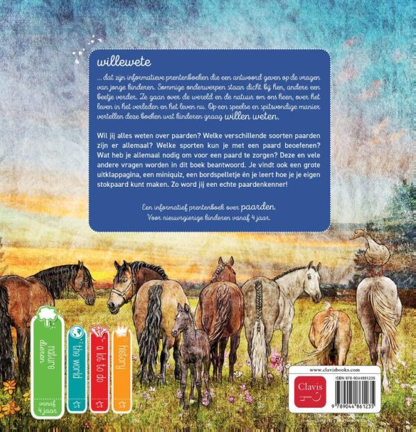 Wil jij alles weten over paarden? Welke verschillende soorten paarden zijn er allemaal? Welke sporten kun je met een paard beoefenen? Wat heb je allemaal nodig om voor een paard te zorgen? Deze en vele andere vragen worden in dit boek beantwoord. Je vindt ook een grote uitklappagina, een miniquiz, een bordspelletje én je leert hoe je je eigen stokpaard kunt maken. Zo word jij een echte paardenkenner!