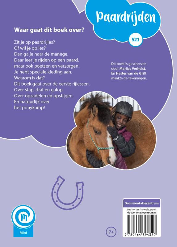 Zit je op paardrijles? Of wil je op les? Dan ga je naar de manege. Daar leer je rijden op een paard, maar ook poetsen en verzorgen. Je hebt speciale kleding aan. Waarom is dat? Dit boek gaat over de eerste rijlessen. Over stap, draf en galop. Over opzadelen en opstijgen. En natuurlijk over het ponykamp!