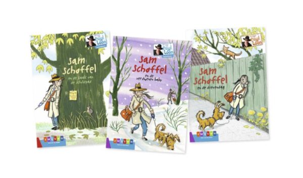 Pakket met drie verschillende toneelleesboeken over meester-speurder Sam Schoffel op AVI M4 voor kinderen van 7 tot 9 jaar. Lost Sam alle zaken op?