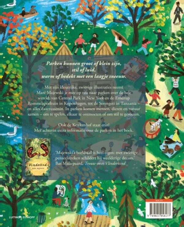 Parken kunnen groot of klein zijn, stil of luid, zonnig of bedekt met een laagje sneeuw. Met zijn kleurrijke, zwierige illustraties neemt Marc Majewski je mee op reis naar parken over de hele wereld: van Central Park in New York en de Keukenhof in Nederland, tot de Serengeti in Tanzania – en alles daartussenin. Dit prachtige non-fictieprentenboek is een liefdesverklaring aan parken en de manier waarop ze mensen, dieren en natuur samenbrengen – om te spelen, elkaar te ontmoeten of om stil te genieten.