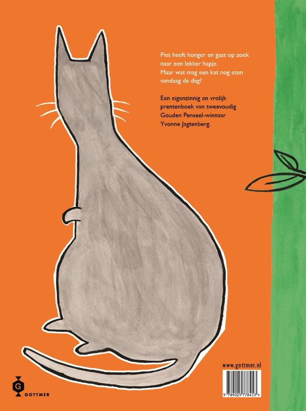 In ‘Piet, de kat die wil weten wat hij wel mag eten’ van Yvonne Jagtenberg wordt Piet, een bolle grijze kater, wakker met een knorrende maag. Vastberaden om iets te eten, staat hij op het punt de eerste vogel die hij ziet te bespringen. Maar dan neemt de vogel het woord en houdt een overtuigend betoog over zijn belangrijke rol in de wereld en waarom hij absoluut niet opgegeten mag worden. Bij elke volgende potentiële hap krijgt Piet dezelfde boodschap te horen. Piet begint te peinzen over zijn eigen plek op de wereld. Hij is maar een gewone kat, misschien niet zo belangrijk. Maar hij wil gewoon weten wat hij WEL mag eten. Gelukkig is er iemand die Piet ontzettend belangrijk vindt en ervoor zorgt dat hij niet hoeft te verhongeren.