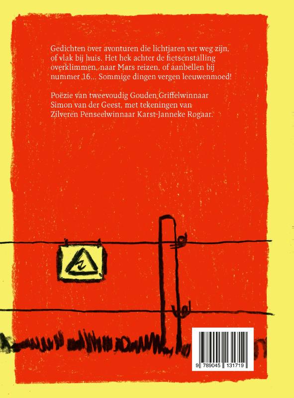 Een bundel met poëzie over spannende en ook grappige dingen: het hek achter de fietsenstalling overklimmen, een schaap leren scheren, ’s nachts zwemmen in de zee. Gedichten over avonturen die lichtjaren ver weg zijn, of vlak bij huis. Want het vergt moed om aan te bellen bij nummer 16 om je bal terug te vragen. Leeuwenmoed! Net als plassen op schrikdraad of van de hoge springen…