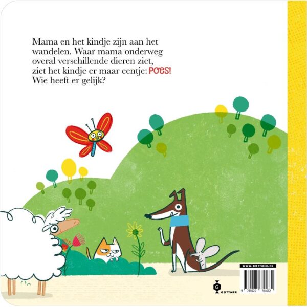 Op een mooie ochtend maken mama en haar kleintje een wandeling. Het kindje wijst en zegt enthousiast: ‘POES!’ Maar mama corrigeert zachtjes. ‘Nee, dat is een kikker.’ Opnieuw roept het kindje: ‘POES!’ En weer legt mama geduldig uit: ‘Ook niet, dat is een hond.’ Mama en haar peuter hebben duidelijk oog voor verschillende dingen om hen heen. Maar attente lezers zullen, naast alle vrolijke dieren die mama benoemt, de poes ontdekken die inderdaad op elke pagina te vinden is.