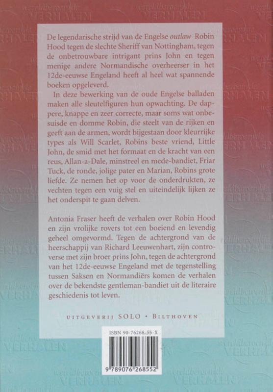 De legendarische strijd van de Engelse outlaw Robin Hood tegen de slechte Sheriff van Nottingham, tegen de onbetrouwbare intrigant prins John en tegen menige andere Normandische overheerser in het 12de-eeuwse Engeland heeft al heel wat spannende boeken opgeleverd. In deze bewerking van de oude Engelse balladen maken alle sleutelfiguren hun opwachting. De dappere, knappe en zeer correcte, maar soms wat onbesuisde en domme Robin, die steelt van de rijken en geeft aan de armen, wordt bijgestaan door kleurrijke types als Will Scarlet, Robins beste vriend, Little John, de smid met het formaat en de kracht van een reus, Allan-a-Dale, minstreel en mede-bandiet, Friar Tuck, de ronde, jolige pater en Marian, Robins grote liefde. Ze nemen het op voor de onderdrukten, ze vechten tegen een vuig stel en uiteindelijk lijken ze het onderspit te gaan delven. Antonia Fraser heeft de verhalen over Robin Hood en zijn vrolijke rovers tot een boeiend en levendig geheel omgevormd. Tegen de achtergrond van de heerschappij van Richard Leeuwenhart, zijn controverse met zijn broer prins John, tegen de achtergrond van het 12de-eeuwse Engeland met de tegenstelling tussen Saksen en Normandiërs komen de verhalen over de bekendste gentleman-bandiet uit de literaire geschiedenis tot leven.