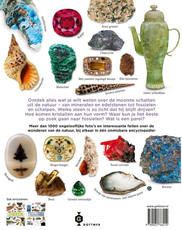 Duik onder de aardkorst met deze prachtige encyclopedie over (edel)stenen, fossielen, mineralen, schelpen en nog meer moois. Informatie in gesteenten, fossielen en mineralen Overal op onze planeet vind je wonderen uit de natuur. Gesteenten en mineralen kunnen ons vertellen hoe onze planeet werd gevormd en in de loop van de tijd voortdurend is veranderd. Ontdek alles wat je wilt weten over de mooiste schatten uit de natuur – van mineralen en edelstenen tot fossielen en schelpen. Welke steen is zo licht dat hij blijft drijven? Hoe komen kristallen aan hun vorm? Waar kun je het beste op zoek gaan naar fossielen? En wat is een parel precies? In deze onmisbare encyclopedie kun je op al deze vragen antwoord vinden! Unieke encyclopedie over de schatten der aarde Het boek besteedt aandacht aan het ontstaan, de samenstelling en de vindplaats van deze natuurlijke schatten, maar gaat ook in op het menselijke gebruik ervan. Met meer dan 1000 fantastische foto’s en honderden fascinerende feitjes.