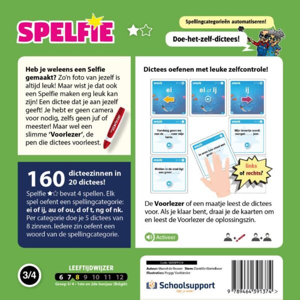 Fan van de Voorlezer pen (‘die praat’), bedacht auteur Marcel de Reuver, leerkracht en spelontwerper, Spelfie. De leukste dictee-oefening, zeg maar! Te gebruiken bovendien mét en zonder de Voorlezer pen. En zo oefenen je leerlingen alleen (of samen als er even geen Voorlezer beschikbaar is) op die lastige spellingcategorieën, vanaf E3 tot verder in groep 6, als het nodig is. Deze praktische en methodische oefening sluit inhoudelijk aan bij alle spellingmethoden. En heeft een unieke zelfcontrole. Natuurlijk ook geschikt voor oefening thuis.