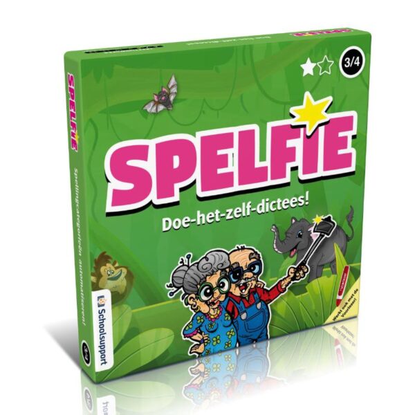 Spelfie groep 3-4 bevat 4 sets met 44 kaarten. Elke set oefent een spellingcategorie met 5 dictees van 8 zinnen. Deze doos bevat de spellingcategorieën ei/ij, au/ou, eind-d/eind-t en ng/nk. Bij de categorieën ei/ij en au/ou is een aparte weetwoordenkaart, waarmee leerlingen eerst de weetwoorden kunnen oefenen.