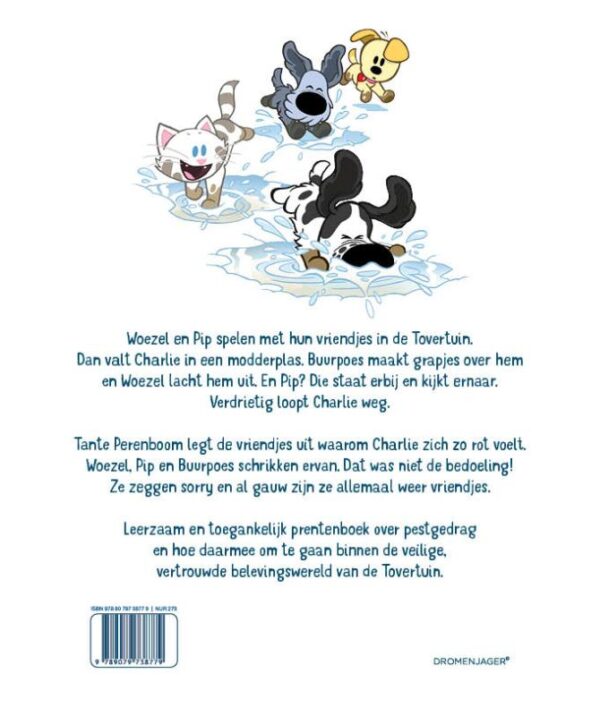Dan valt Charlie in een modderplas. Buurpoes maakt grapjes over hem en Woezel lacht hem uit. En Pip? Die staat erbij en kijkt ernaar. Verdrietig loopt Charlie weg.