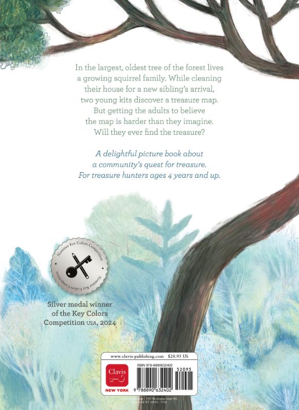 In the largest, oldest tree of the forest lives a growing squirrel family. While cleaning their house for a new sibling’s arrival, two young kits discover a treasure map. But getting the adults to believe the map is harder than they imagine. Will they ever find the treasure?