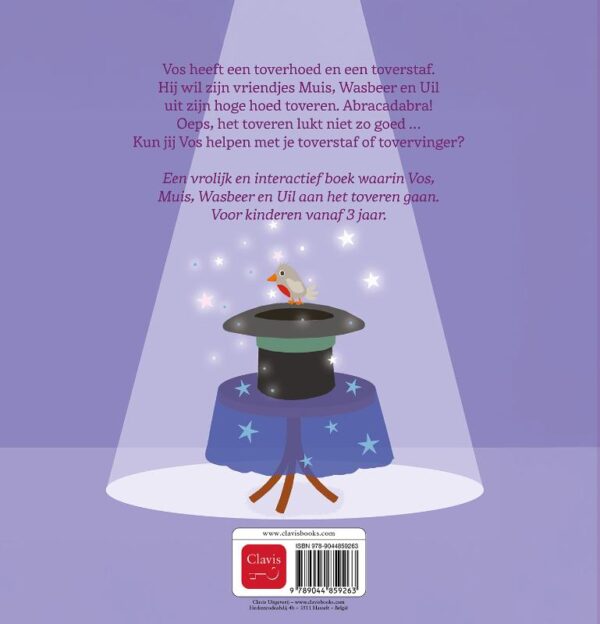 Vos heeft een toverhoed en een toverstaf. Hij wil zijn vriendjes Muis, Wasbeer en Uil uit zijn hoge hoed toveren. Abracadabra! Oeps, het toveren lukt niet zo goed … Kun jij Vos helpen met je tovervinger?