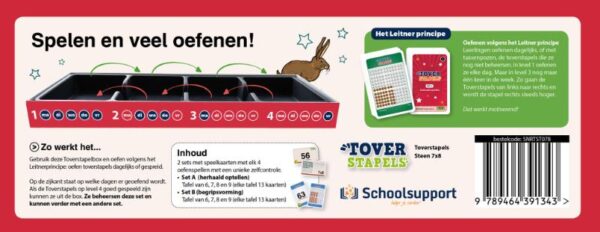 Toverstapels traint efficiënt de tafels van 6 t/m 9 volgens het Leitnerprincipe. De doos bevat twee sets met vier trainingspellen met unieke zelfcontrole en kan gebruikt worden als Leitnerbox. Elk spel heeft 13 kaarten met een unieke zelfcontrole. De spellen trainen de tafels van steen 7×8 uit het rekenmuurtje van Bareka. Deze (moeilijke) tafels van 6, 7, 8 en 9 worden op twee manieren zelfstandig geoefend.