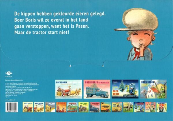 In ‘Boer Boris en de eieren’ hebben de kippen extra hun best gedaan om vrolijke, gekleurde eieren te leggen. Boris laadt ze op de trekker om ze te verstoppen door het héle land, en de kippen gaan gezellig mee. Maar na een bijna-botsing met de Paashaas zijn alle eitjes stuk. Van schrik leggen de kippen opnieuw een ei, maar dit keer zijn ze helaas niet zo mooi gekleurd. Er moet gauw iets gebeuren. Maar hoe komen ze aan kleuren? Dankzij deze Boer Boris-vertelplaten is het nóg leuker om een groep kinderen voor te lezen. Terwijl de kinderen naar de mooie prenten kijken, leest de voorlezer de tekst voor die op de achterkant is gedrukt. Handig! De 13 stevige, losse A3-platen passen in een standaard vertelkastje (niet meegeleverd), maar de verteller kan ze natuurlijk ook gewoon zelf vasthouden.