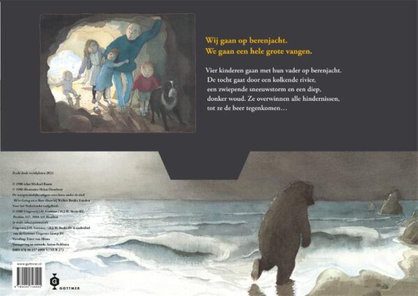 In ‘Wij gaan op berenjacht’ gaan vijf kinderen op jacht naar een hele grote beer om te vangen. Niets is ze te gek en ze zijn nergens bang voor. Kolkende rivieren, sneeuwstormen of donkere bossen, ze gaan er dwars doorheen. Maar dan komen ze een echte beer tegen… ‘Wij gaan op berenjacht’ wordt al meer dan 30 jaar voorgelezen in Nederland! Dankzij het formaat van de 20 grote vertelplaten komen de betoverende illustraties nog beter tot hun recht. Terwijl de kinderen naar de grote prenten kijken, leest de voorlezer de tekst die op de achterkant is gedrukt.