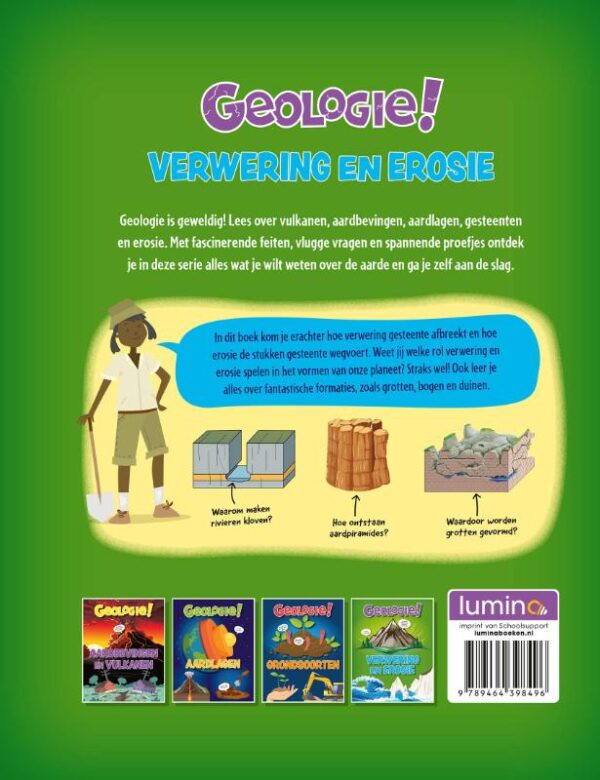 In dit boek kom je erachter hoe verwering gesteente afbreekt en hoe erosie de stukken gesteente wegvoert. Weet jij welke rol verwering en erosie spelen in het vormen van onze planeet? Straks wel!