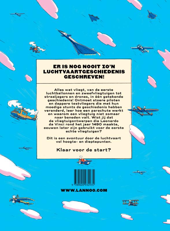 Alles wat vliegt, van de eerste luchtballonnen en zweefvliegtuigen tot straaljagers en drones, in één getekende geschiedenis! Ontmoet stoere piloten en dappere testvliegers die met hun moedige stunts de geschiedenis hebben veranderd, leer hoe een parachute werkt en waarom een vliegtuig niet zomaar naar beneden valt. Wist jij dat de vliegtuigontwerpen die Leonardo da Vinci rond het jaar 1490 maakte, eeuwen later zijn gebruikt voor de eerste echte vliegtuigen?