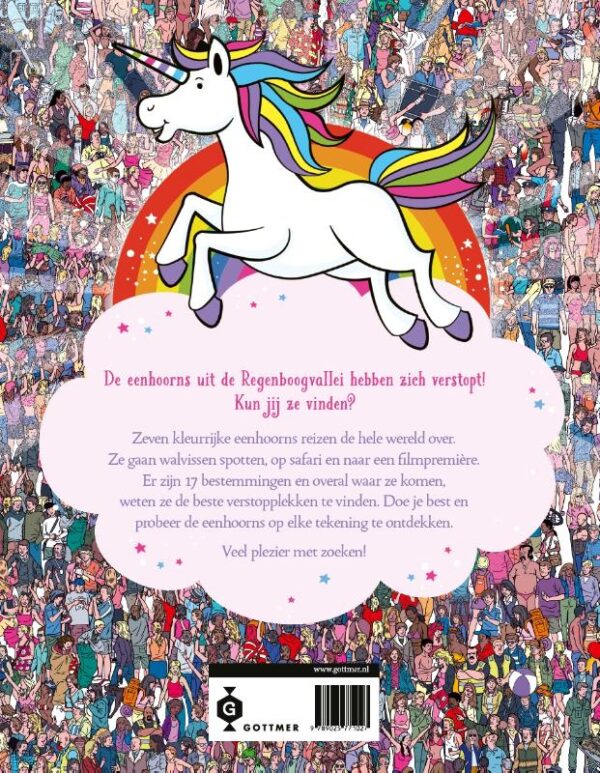 ‘Waar is de eenhoorn?’ is een vrolijk en grappig zoekboek, geïllustreerd door Paul Moran, waarin je op zoek gaat naar alle zeven eenhoorns. De eenhoorns hebben hun favoriete verstopplekjes in de Regenboogvallei nu al zó vaak gebruikt dat ze op vakantie gaan. Ze komen op 17 bestemmingen en vinden de mooiste verstopplekken van de wereld; zo gaan ze walvisspotten, op safari en naar een filmpremière.
