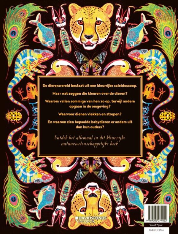Waarom springen sommige dieren er opzettelijk uit, terwijl andere ernaar streven om op te gaan in de omgeving? Waarom zijn sommige slim om andere te waarschuwen, terwijl andere alleen maar doen alsof ze er giftig uitzien? Waarom zijn sommige mannelijke dieren zoveel flamboyanter dan hun vrouwelijke tegenhangers? Waarom zien sommige baby’s er zo anders uit dan de volwassenen van het gezin? Het dierenrijk wordt als nooit tevoren verkend in dit rijk gedetailleerde natuurhistorisch boek, boordevol kleur. Een prachtig geïllustreerde eerste blik op de kleurrijke en caleidoscopische wereld van dieren voor jonge kinderen.