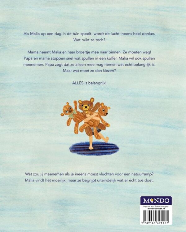 Mama neemt Malia en haar broertje mee naar binnen. Ze moeten weg! Papa en mama stoppen snel wat spullen in een koffer. Malia wil ook spullen meenemen. Papa zegt dat ze alleen mee mag nemen wat echt belangrijk is. Maar wat moet ze dan kiezen?