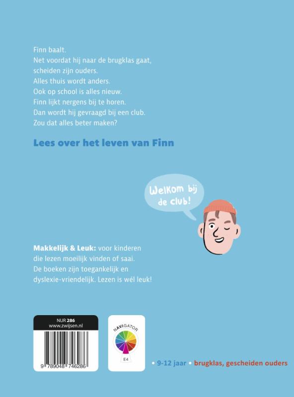 Ga je eindelijk naar de brugklas, vertellen je ouders je dat ze gaan scheiden. Nóg meer veranderingen in je leven, heftig. Lees hoe Finn hiermee omgaat. Zou de club kinderen van gescheiden ouders alles makkelijker maken? Of juist niet … Herkenbaar verhaal op AVI E4 voor kinderen van 9-12 jaar in de serie ‘Makkelijk & Leuk’, speciaal voor kinderen die lezen moeilijk vinden of saai. Zo krijgen zij weer plezier in lezen. Dyslexievriendelijk!