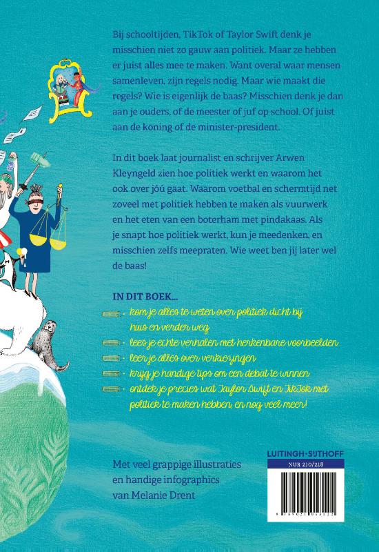 Bij schooltijden, TikTok en Taylor Swift denk je misschien niet zo gauw aan politiek. Maar ze hebben er juist van alles mee te maken! In Wie is de baas? legt Arwen Kleyngeld op een toegankelijke manier uit wat politiek is en waarom die iedereen aangaat. Na het lezen van de waargebeurde verhalen, herkenbare voorbeelden en historische weetjes wordt politiek iets waar je zelf over mee wilt praten. Want wie is er nou eigenlijk de baas?