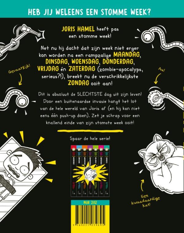 De stomste week ooit van Joris Hamel lijkt maar niet op te houden. Na vijf rampzalige schooldagen en een verschrikkelijke zaterdag dacht hij dat het niet erger kon. Maar helaas! Door een catastrofale alieninvasie lijkt het lot van de gehele planeet op de schouders van Joris te rusten (en hij kan niet eens één push-up doen). Maak je klaar voor het knallende slotstuk van deze internationale bestsellerserie.