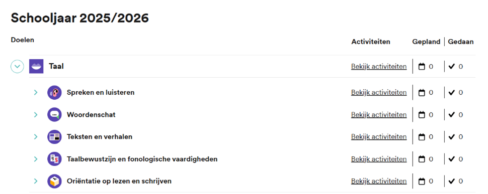 Vanuit het doelenoverzicht kun je nu rechtstreeks doorklikken naar bijbehorende activiteiten. Klik je op een ontwikkelingsgebied, domein of doel? Dan opent automatisch een activiteitenoverzicht waarin de relevante activiteiten al zijn voorgeselecteerd. Zo zie je in één oogopslag welke activiteiten bijdragen aan een specifiek leerdoel.